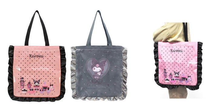 ポーチには中身が見えるマスコットが付いており、トートバッグはピンクとブラックのフリルが魅力的。