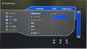 モニターの設定画面で、「ゲーミング設定」→「Adaptive Sync」→オン