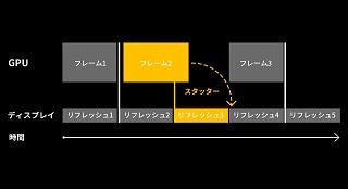 重たいゲームにPC側(グラフィックボード)の処理が追い付かず、2フレーム以上同じ画像が表示されてしまう現象。主にグラフィックボードのフレームレートがモニターのリフレッシュレートを下回る場合に、映像に一瞬カクつきが発生するもの。
