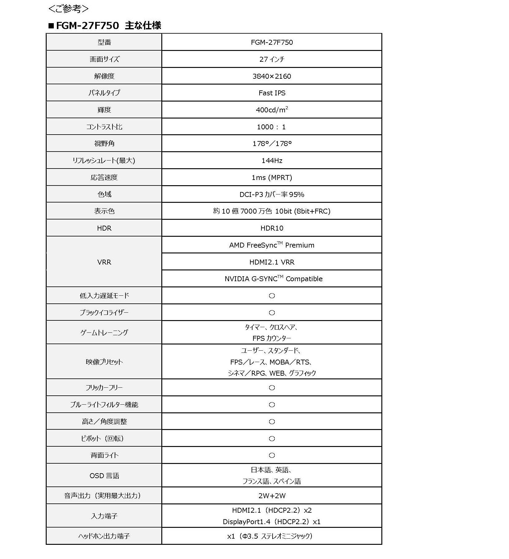 「FGM-27F750」がこのたび認証を取得したNVIDIA社のVRR(Variable Refresh Rate:可変リフレッシュレート)規格「G-SYNC Compatible」は、NVIDIA社が表示品質などをチェックし、可変リフレッシュレート(VRR)によりティアリングとカクつきのないゲーミングが可能と確認されたモニターに付与されるものです。可変リフレッシュレート(VRR)に対応したパソコンの出力信号に応じて最適なリフレッシュレートに同期させることでその能力をフルに発揮させることができ、パソコンでゲームを楽しむユーザーに繊細で綺麗なグラフィック表現のRPG、視認性が勝敗に大きく影響する動きの速いFPSにおいて、極めて快適なゲームプレイをご提供します。AMD FreeSync Premium/HDMI2.1 VRRへの対応に加えて「G-SYNC Compatible」に対応することにより、当社は本モニター「FGM-27F750」を幅広いゲームユーザーのニーズに寄り添う高付加価値なゲーミングモニターとして提案して参ります。