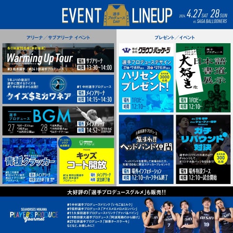 4月27日(土)と28日(日)の佐賀バルーナーズ戦は「選手プロデュースDAY」と題され、選手が企画したイベントが盛りだくさんです。
