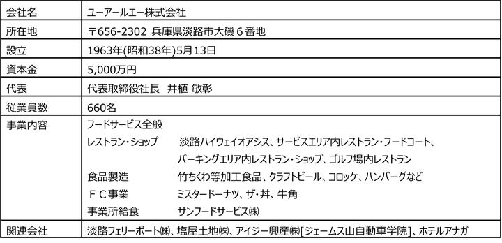 運営会社はユーアールエー株式会社で、フードサービス全般を展開しています。
