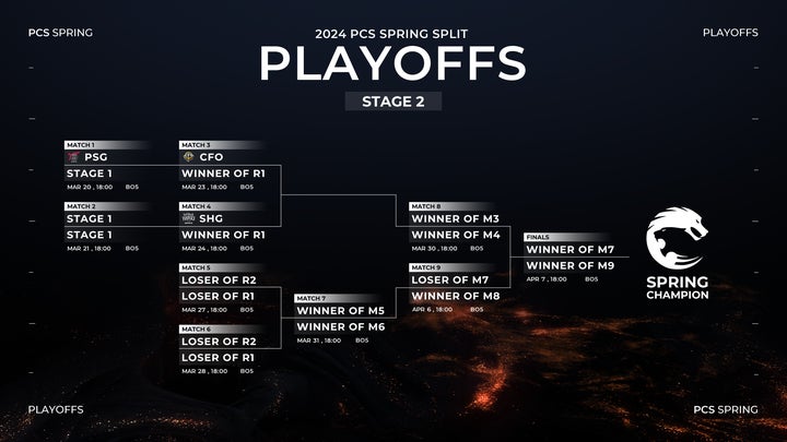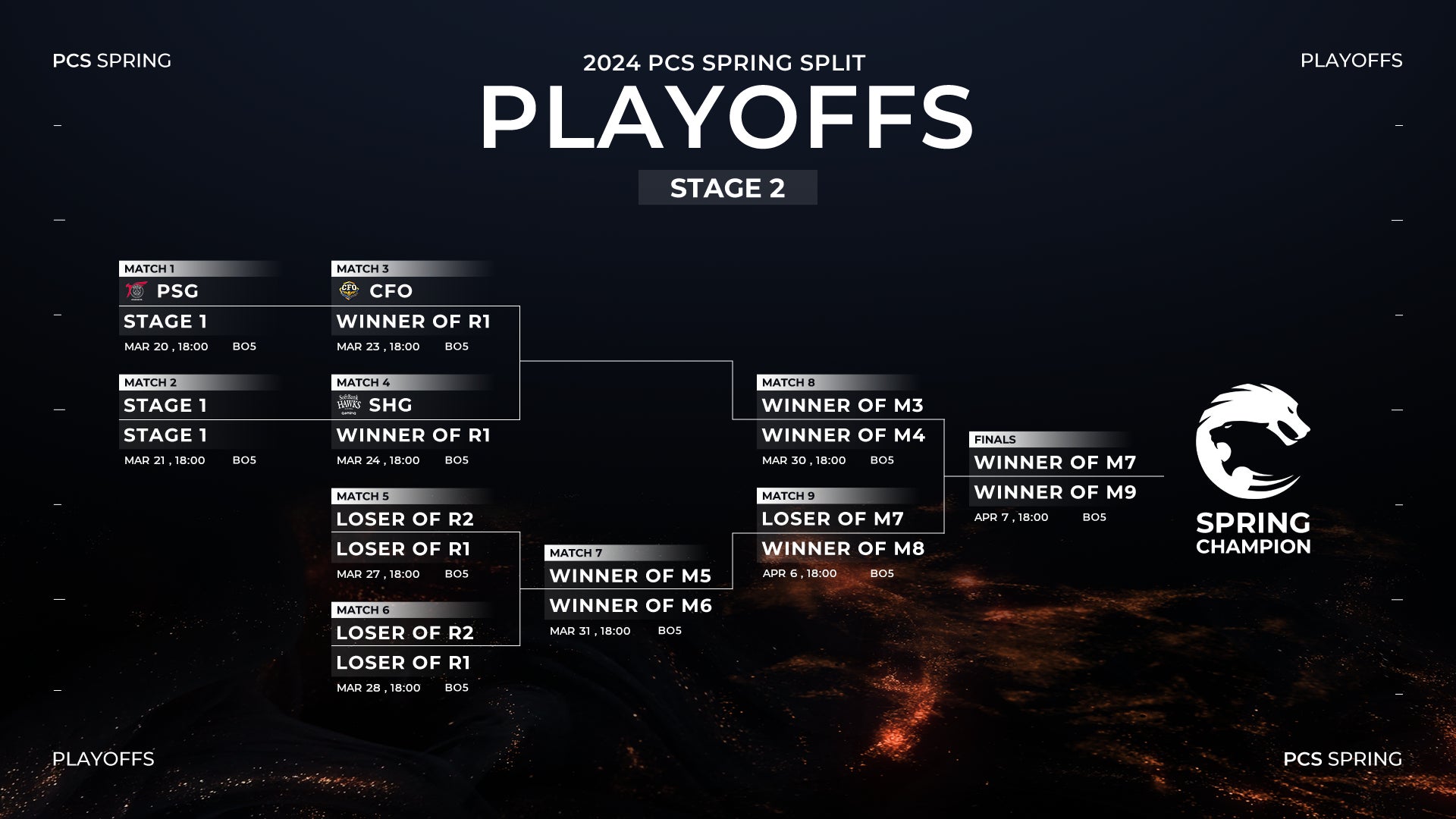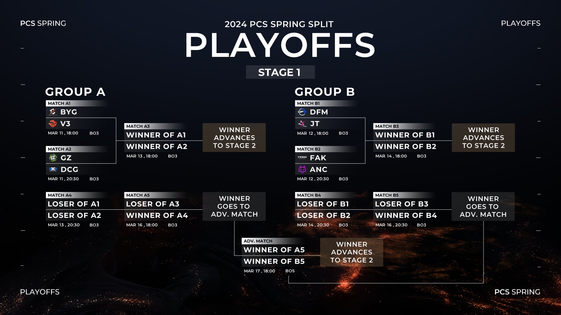 PCS PlayoffsにはBYG、CFO、DCG、FAK、PSG、JTが参加し、LJLからはDFM、SHG、V3、LCOからはGZ、ANCが出場します。
