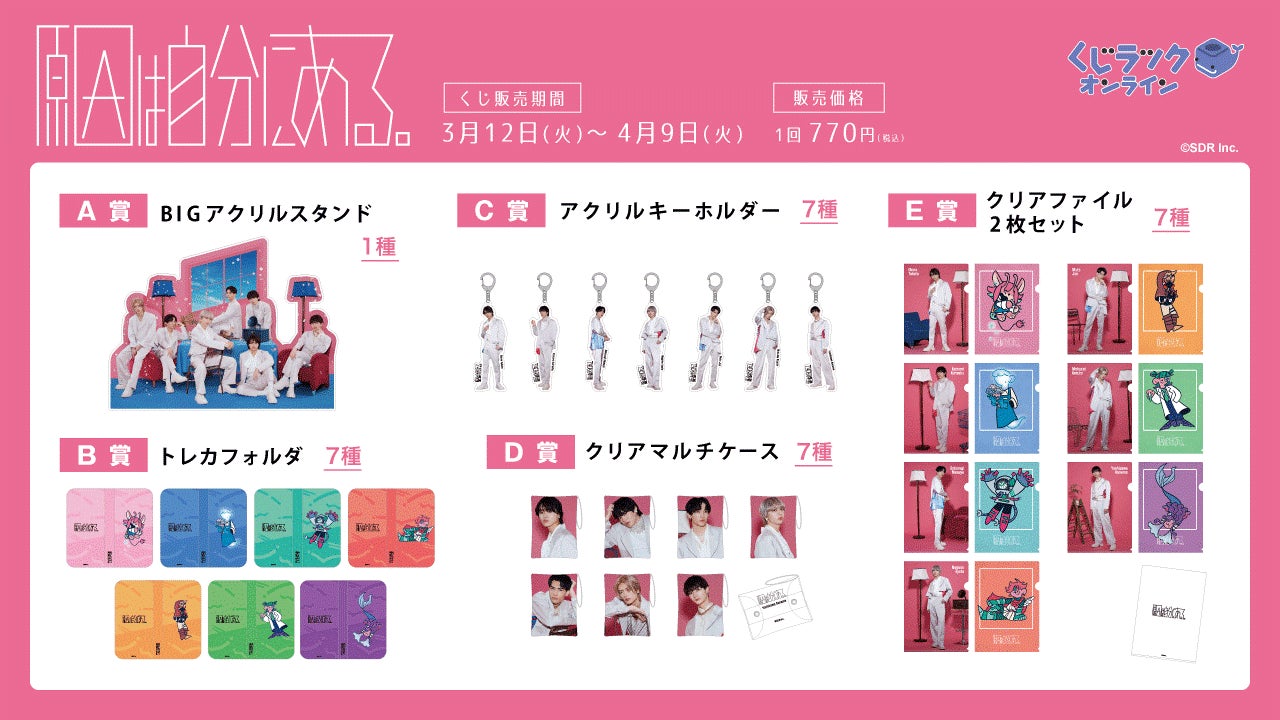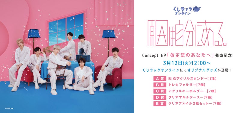 2024年3月12日(火)から始まる「くじラックオンライン」では、CEとコンセプトEP「仮定法のあなたへ」とのコラボキャラクターグッズが手に入ります。