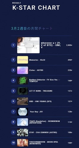 3月8日の放送回で、UMIとVの「wherever u r (ft.V of BTS)」が2週連続で1位を獲得しました。
