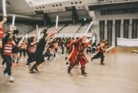 チャンバラ合戦という非日常体験を通して、受講者が意欲的かつ実践的に学ぶことを目指します。
