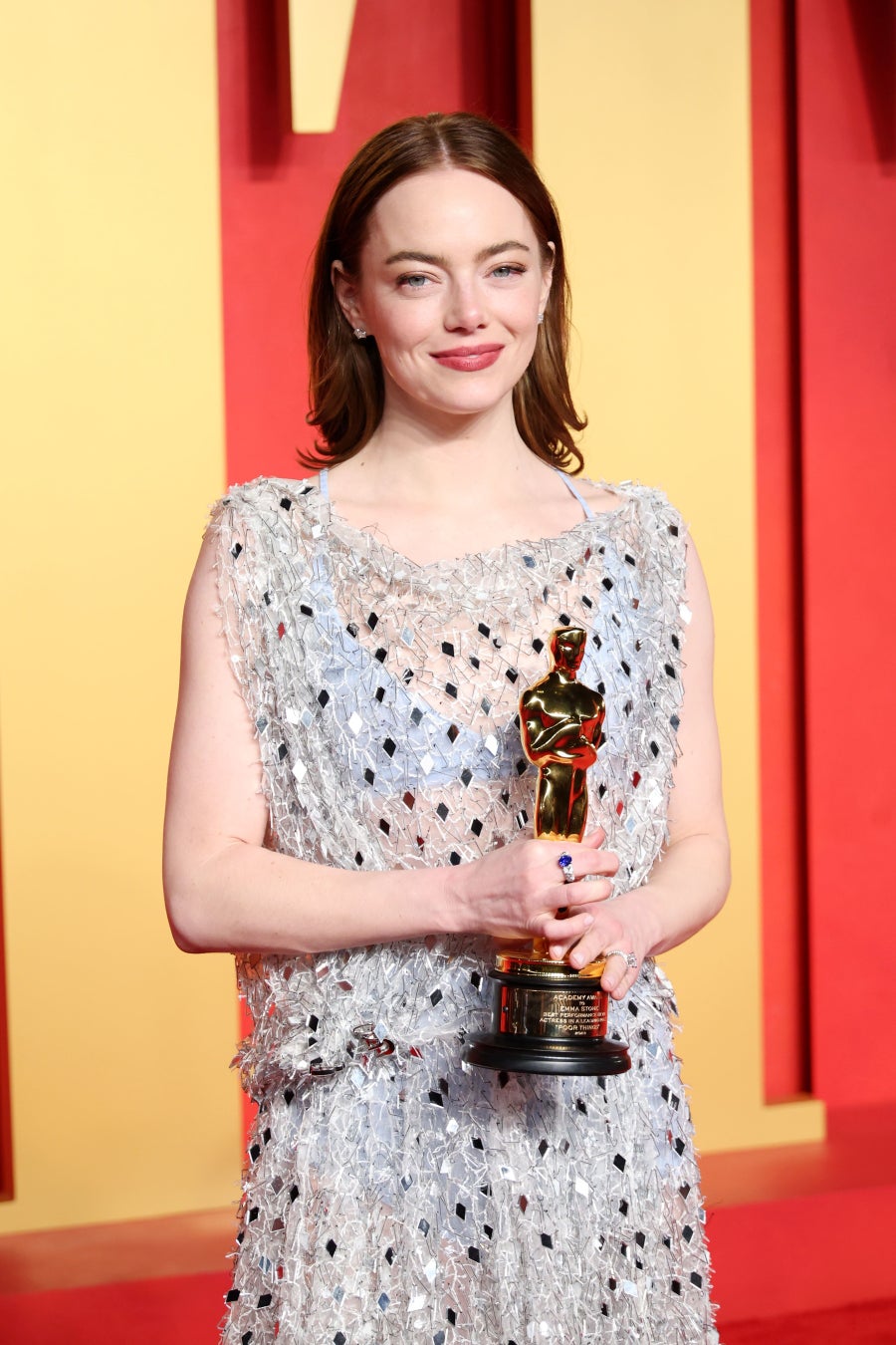 エマ・ストーンはライトブルーのドレスにダイヤモンドシェイプのミラー刺繍が施され、ロバート・ダウニー・Jr.はブラックのダンディジャケットを着用しました。