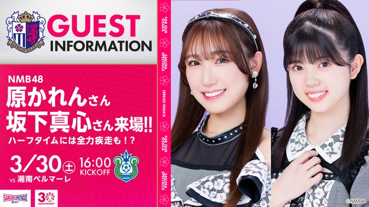 3/30(土)の湘南戦には、NMB48の原かれんさんと坂下真心さんが来場します。