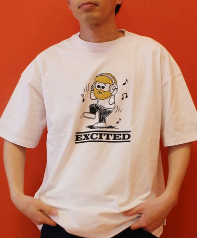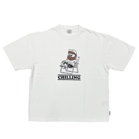釣りやアウトドア、サウナ、ロックミュージックなどのシーンがポップなイラストで表現されており、発泡プリントで描かれた髪やヒゲが特徴的です。