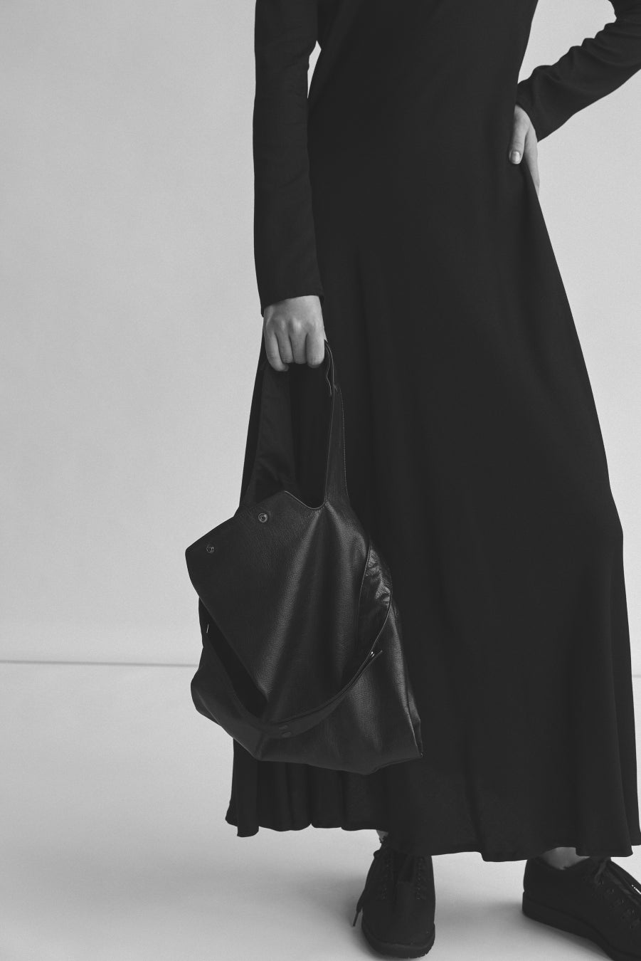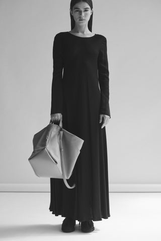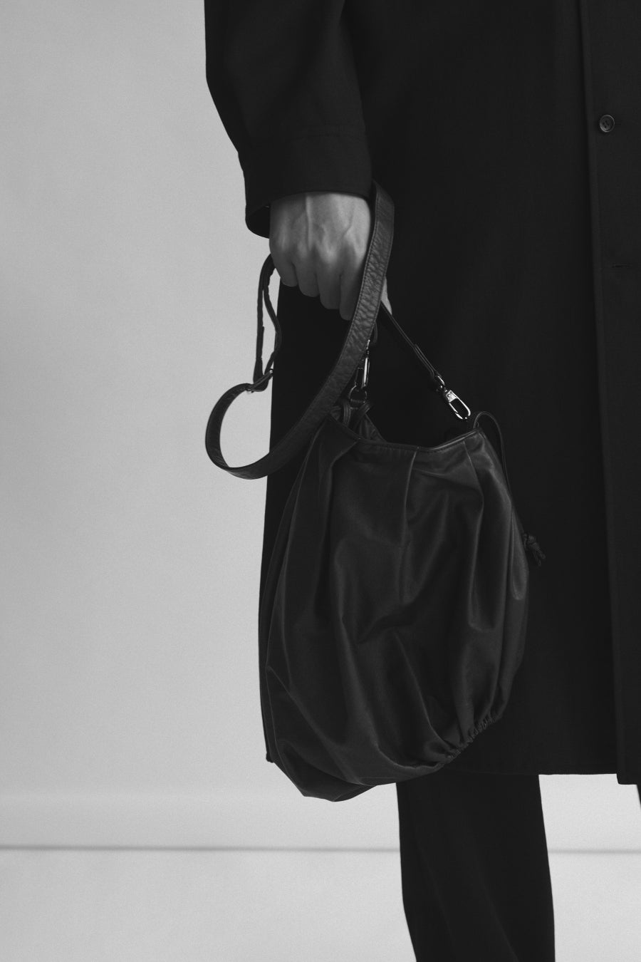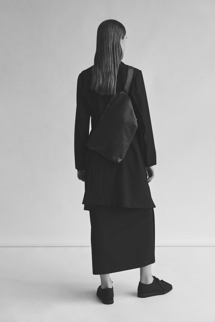 Yohji Yamamotoの2024年春夏コレクション「Coquillage」は、ネックラインに紐が通され、裾にギャザーが施されたバルーンスカート風のユニークなディテールが特徴的です。