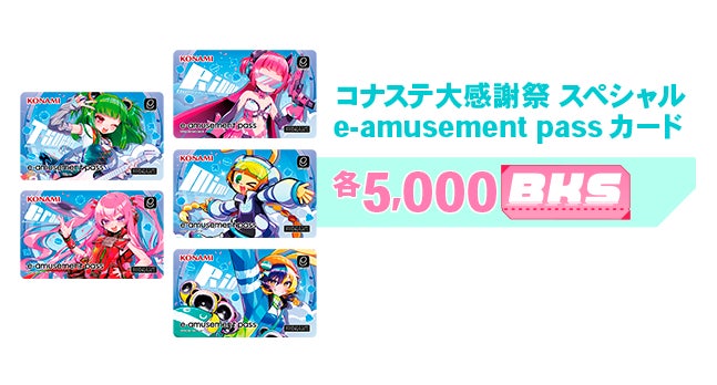 イベントでは「コナステ大感謝祭プレゼントキャンペーン」も実施され、対象アイテムを購入したり「コナプラ」をプレーして「BKS」をためると、スペシャルアクリルスタンドやe-amusement passカードがもらえます。