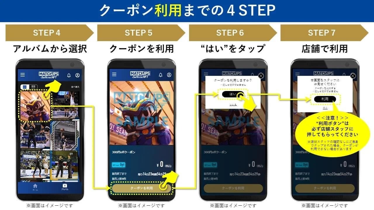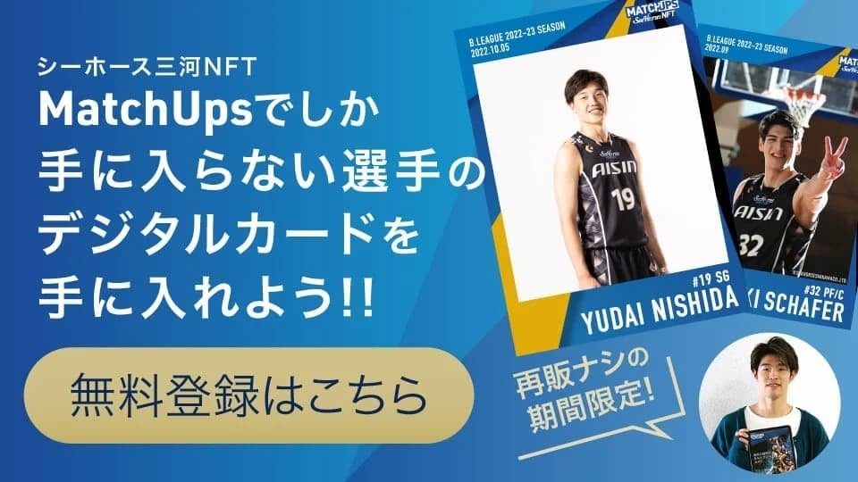 シーホース三河の限定デジタルコンテンツ(NFT)サービス「MatchUps」で、ファンフェス2022-23で使用できる「300円割引クーポン」が先着200名に配布される。