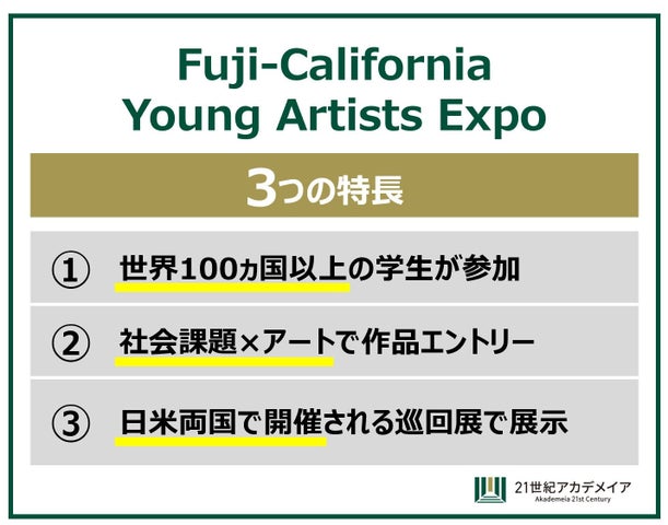 学校法人21世紀アカデメイア主催の国際コンペ「Fuji-California Young Artists Expo」は、社会問題をテーマにしたアート作品を募集しています。