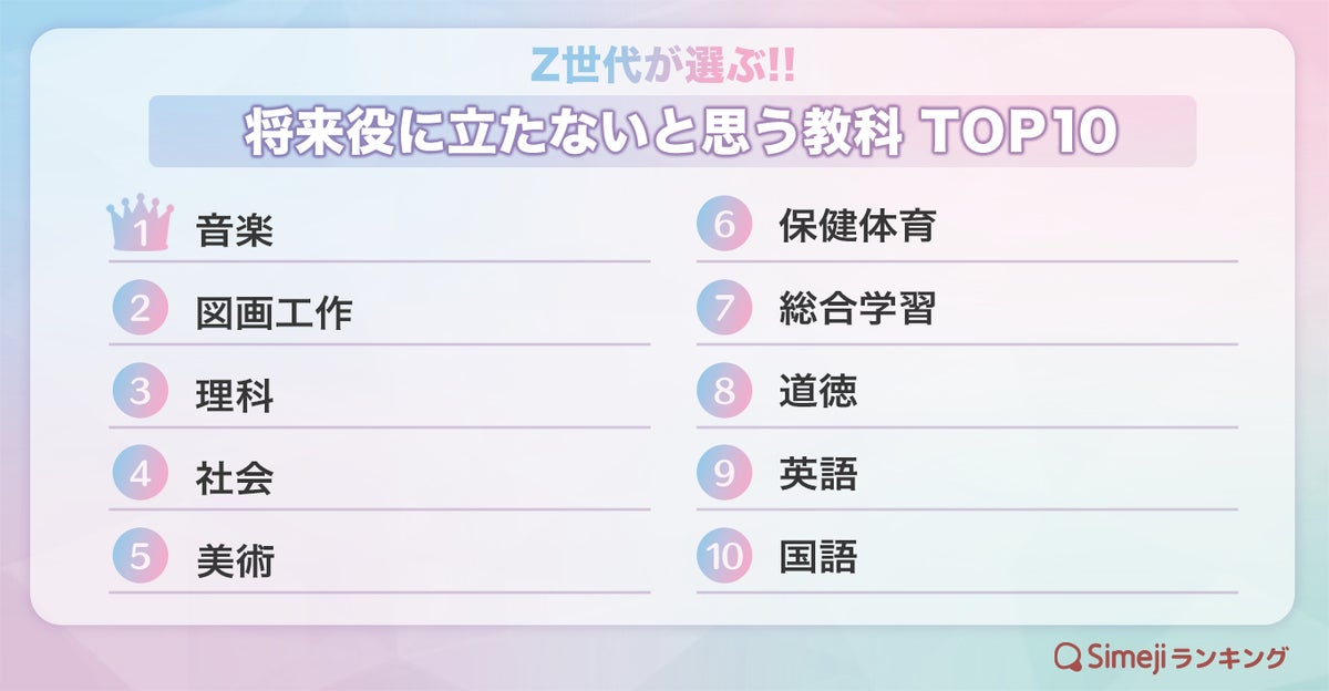 - Z世代の「将来役に立たない教科TOP10」をSimejiアプリがランキング化
