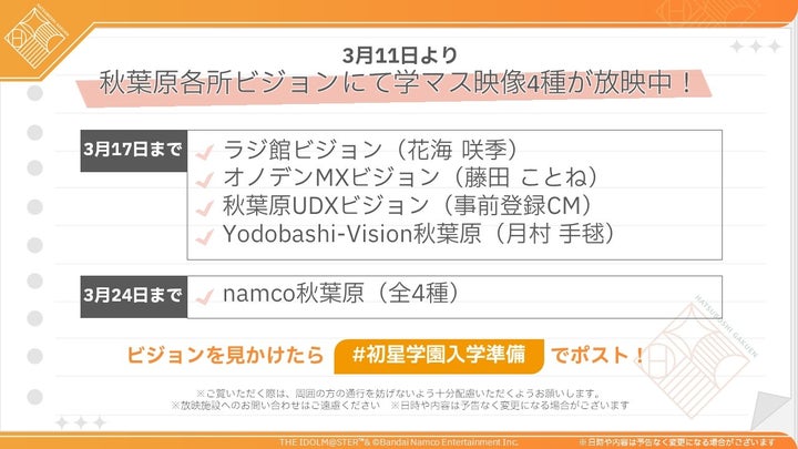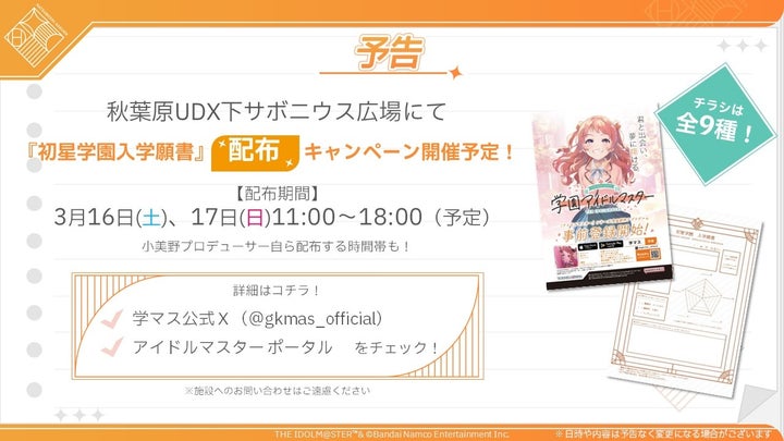 - 次回生配信は3月20日、秋葉原で学マス映像放映、入学願書配布キャンペーンも