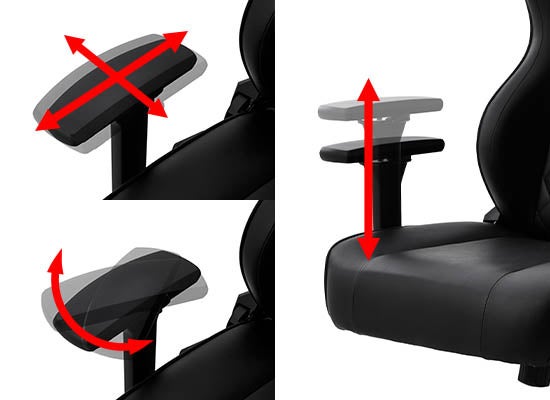 4Dアームレストを採用し、上下左右前後内外に調整することで、ひとりひとりに合ったポジション設定が可能に。アームパッドはソフト加工を施しており、柔らかにフィットします。(画像はTHRONEシリーズモデルです)