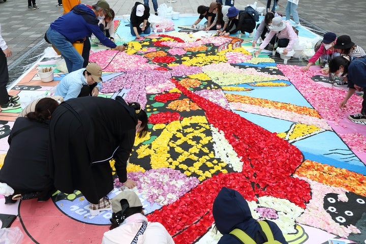 • インフィオラータは自然素材で絵を作るアートで、今年は新デザインのヤン坊マー坊を描く