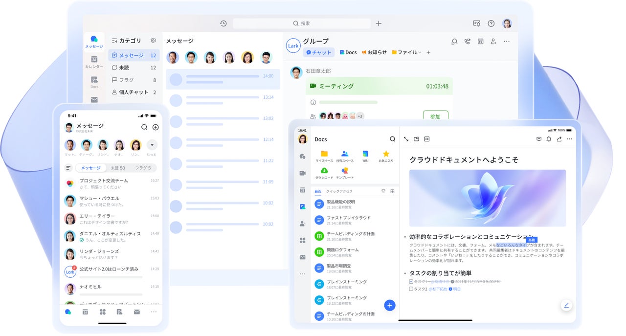 Larkは、あらゆるニーズに対応する1つのスイートで、チームの共同作業を可能にする次世代コラボレーションツールを特徴としています。チャットを起点に、メール・カレンダー・ビデオ会議・ドキュメント・ワークフロー・バックオフィス機能など、多数の頻用ツールを1つのプラットフォームに統合することで、より効果的なコラボレーションが実現できます。すべての機能が1つのアプリに統合されており、Mac、Windows、iOS、Androidで利用可能です。