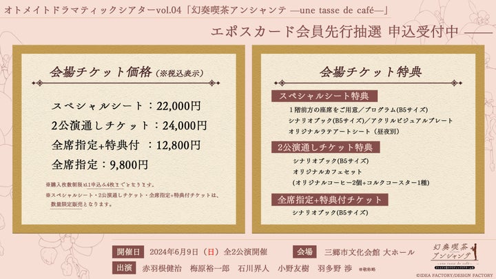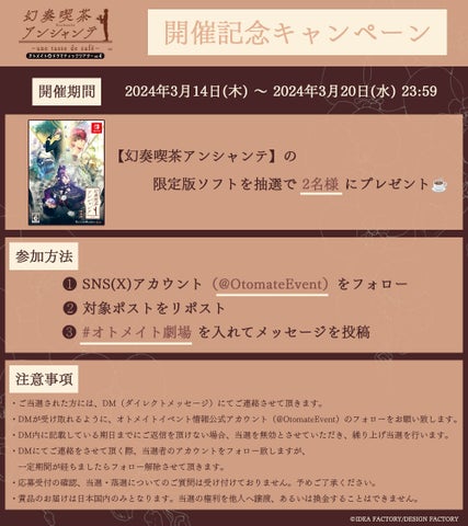 アイディアファクトリー株式会社の女性向けゲームブランド「オトメイト」は、2024年6月9日に開催されるイベント「幻奏喫茶アンシャンテ」のチケット申込を受け付けています。