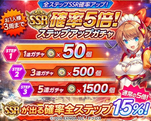 SSR確率5倍のステップアップガチャも実施されますので、公式サイトで最新情報をチェックしてください。