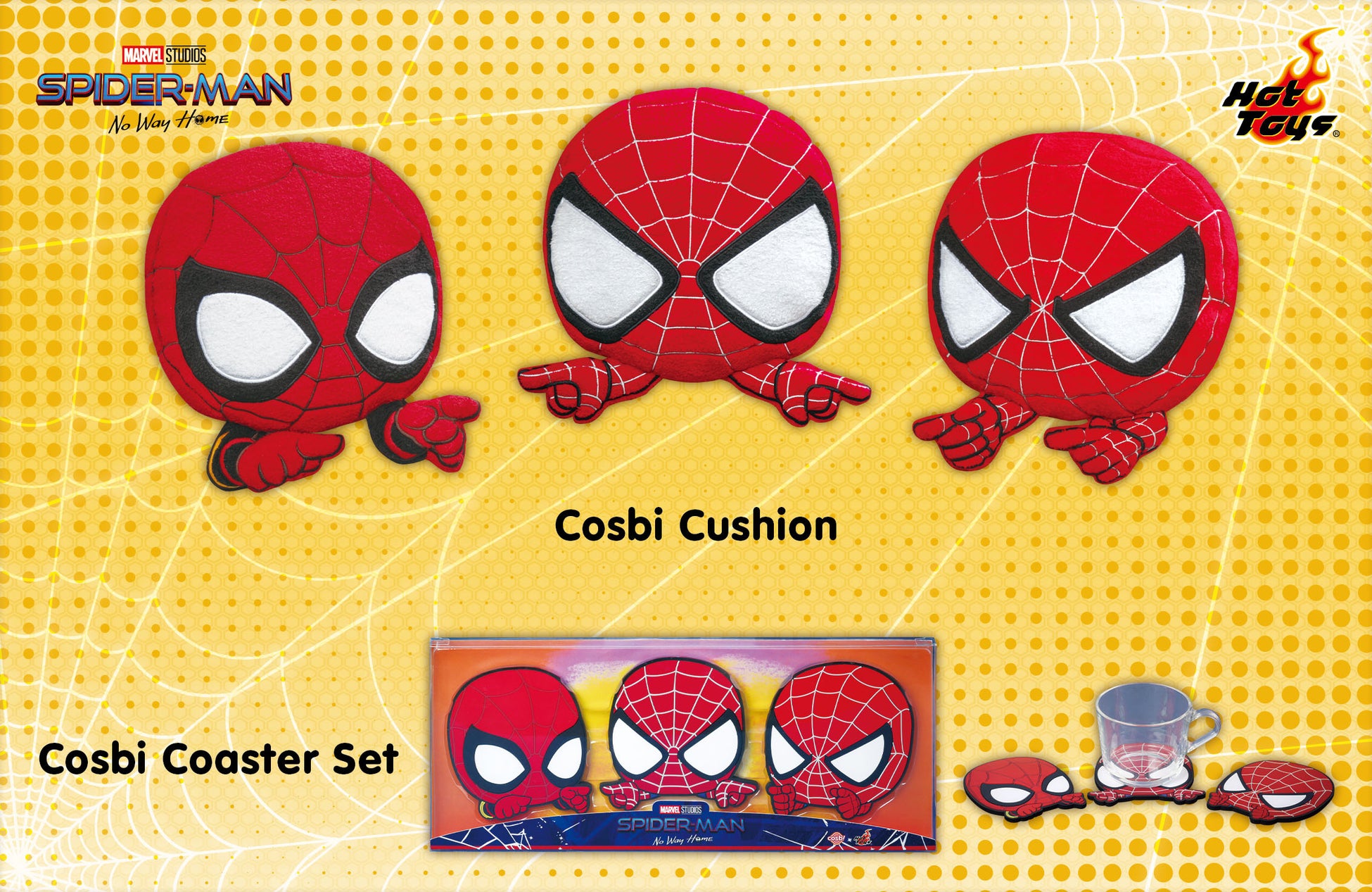 映画『スパイダーマン:ノー・ウェイ・ホーム』より、お馴染みの指差しポーズを再現した大人気「コスビ」シリーズのスパイダーマンたちが、可愛いクッションとコースターになって登場!