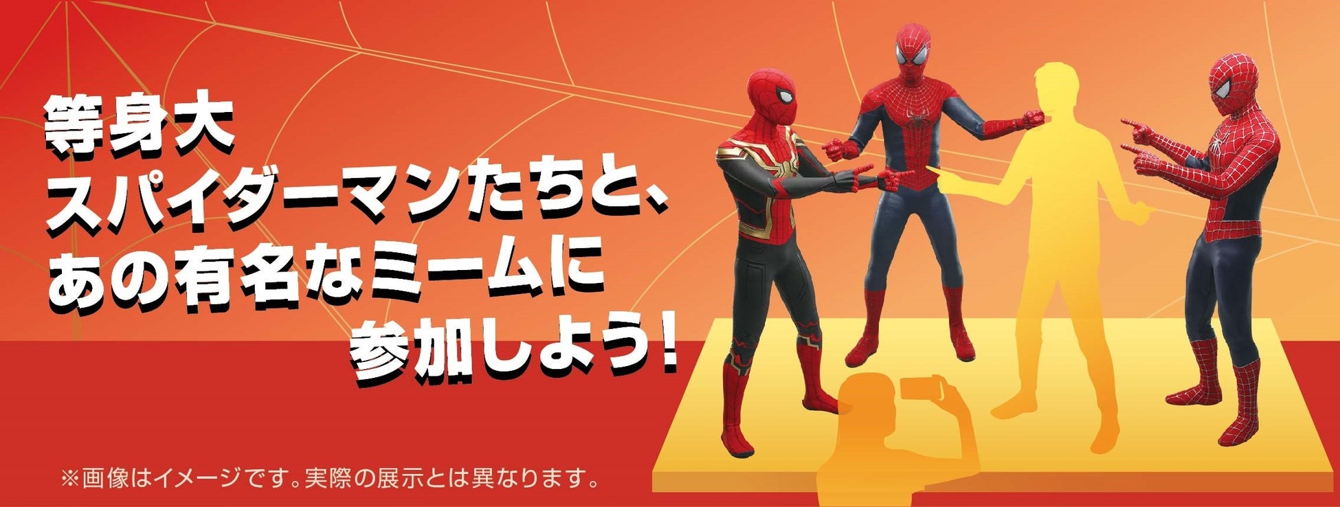 さらに、映画『スパイダーマン:ノー・ウェイ・ホーム』のスパイダーマン(ピーター1・2・3)が、等身大サイズで店内に登場!指を指し合う有名なネットミームを再現したポーズに参加して、一緒に写真撮影が可能です。