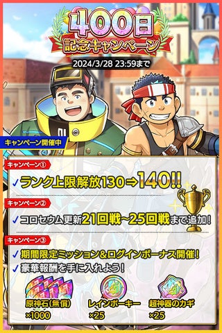 また、クレサガのリリース400日を記念してキャンペーンが開催され、ランク上限が解放されたり、ログインボーナスやミッションが充実します。