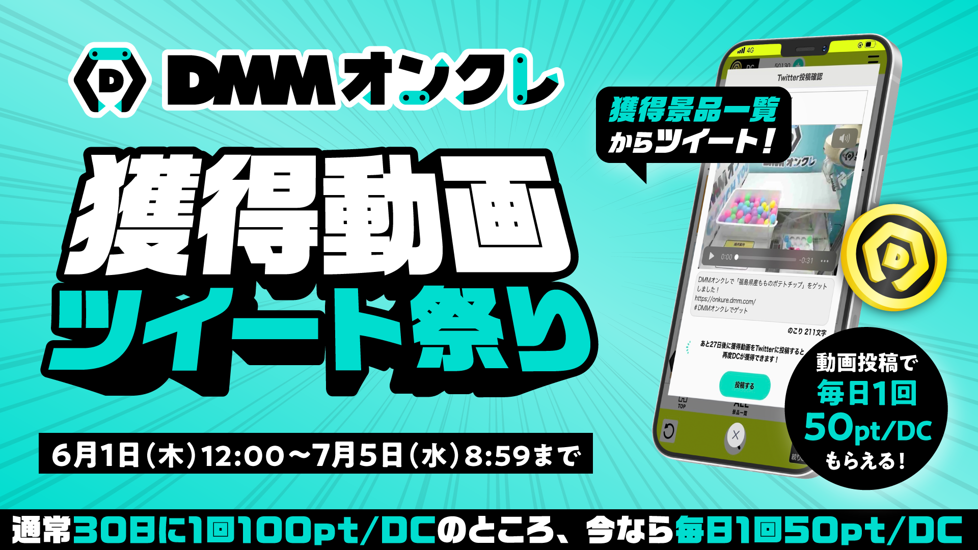また、プライズを獲得できた動画をTwitterにアップすることで、最大1,750pt/DCがもらえる「獲得動画ツイート祭り」も実施される。