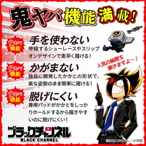 ブラックチャンネルはYouTubeで大人気のアニメであり、スパットシューズの主な機能や商品詳細も紹介されています。