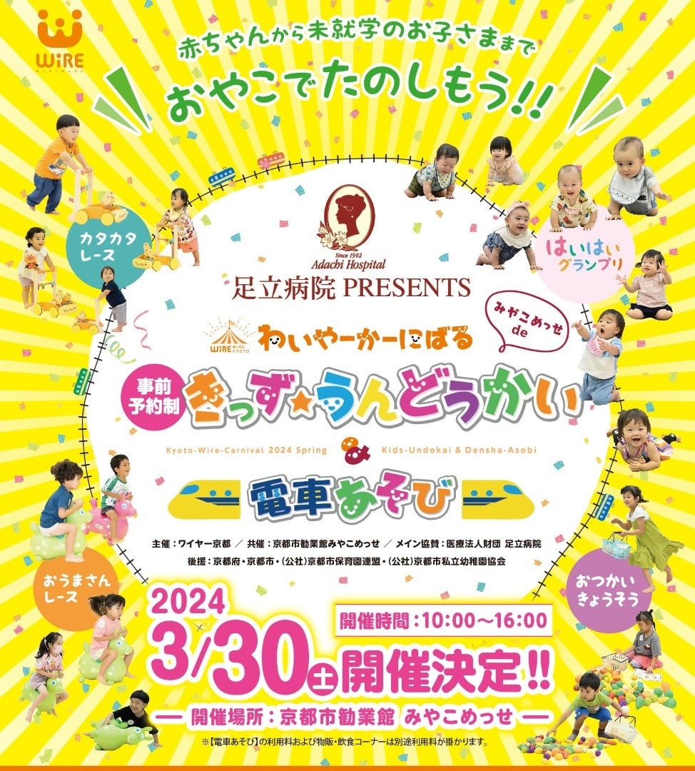 2024年3月30日(土)に京都市勧業館みやこめっせで開催される子育てファミリー体験型イベント「みやこめっせ de わいやーかーにばる〈きっず★うんどうかい&電車あそび〉」は、未就学児向けの楽しいプログラムが盛りだくさんです。