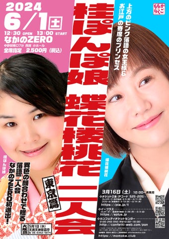 2024年6月1日、なかのZERO 小ホールで開催される『桂ぽんぽ娘 蝶花楼桃花 二人会(東京篇)』のチケットが3月16日10:00から販売開始。