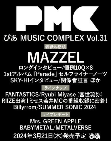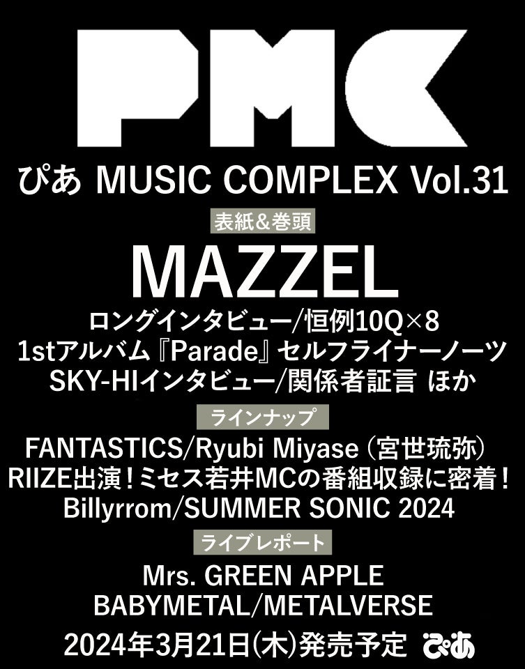 BMSG所属のダンス&ボーカルグループ・MAZZELが『ぴあMUSIC COMPLEX Vol.31』の表紙&裏表紙を飾り、1stアルバム『Parade』に関するロングインタビューや全曲解説が掲載されます。