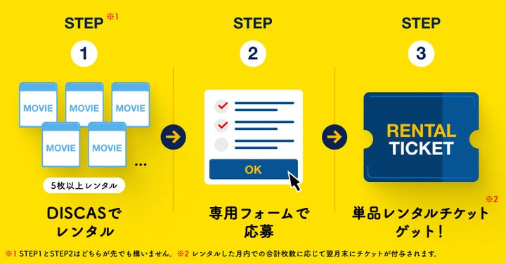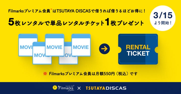 Filmarksプレミアム会員がTSUTAYA DISCASの都度払いプランで5枚レンタルすると、単品レンタルチケットがもらえるキャンペーンが開催されています。