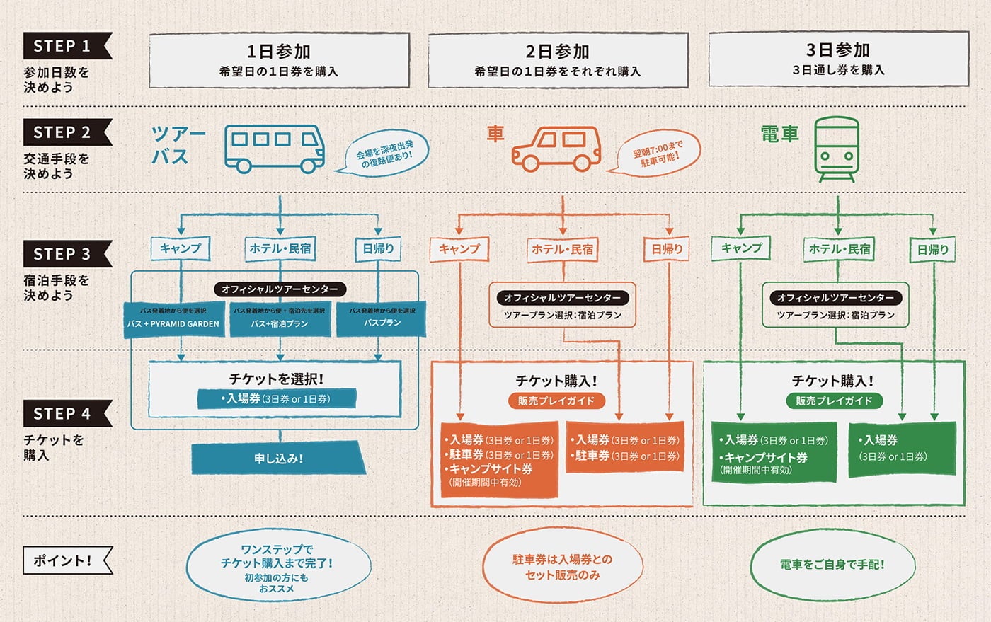 フジロックへの交通手段や宿泊手段についても詳細が案内されていますので、ぜひチェックしてみてください。
