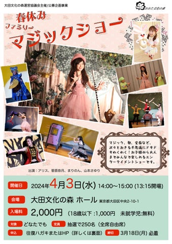 2024年4月3日に大田文化の森ホールで開催される「春休みファミリーマジックショー」は、4人の実力派女性パフォーマーが集結し、マジック、イリュージョン、変面、歌などの魅力を1時間に凝縮したイベントです。
