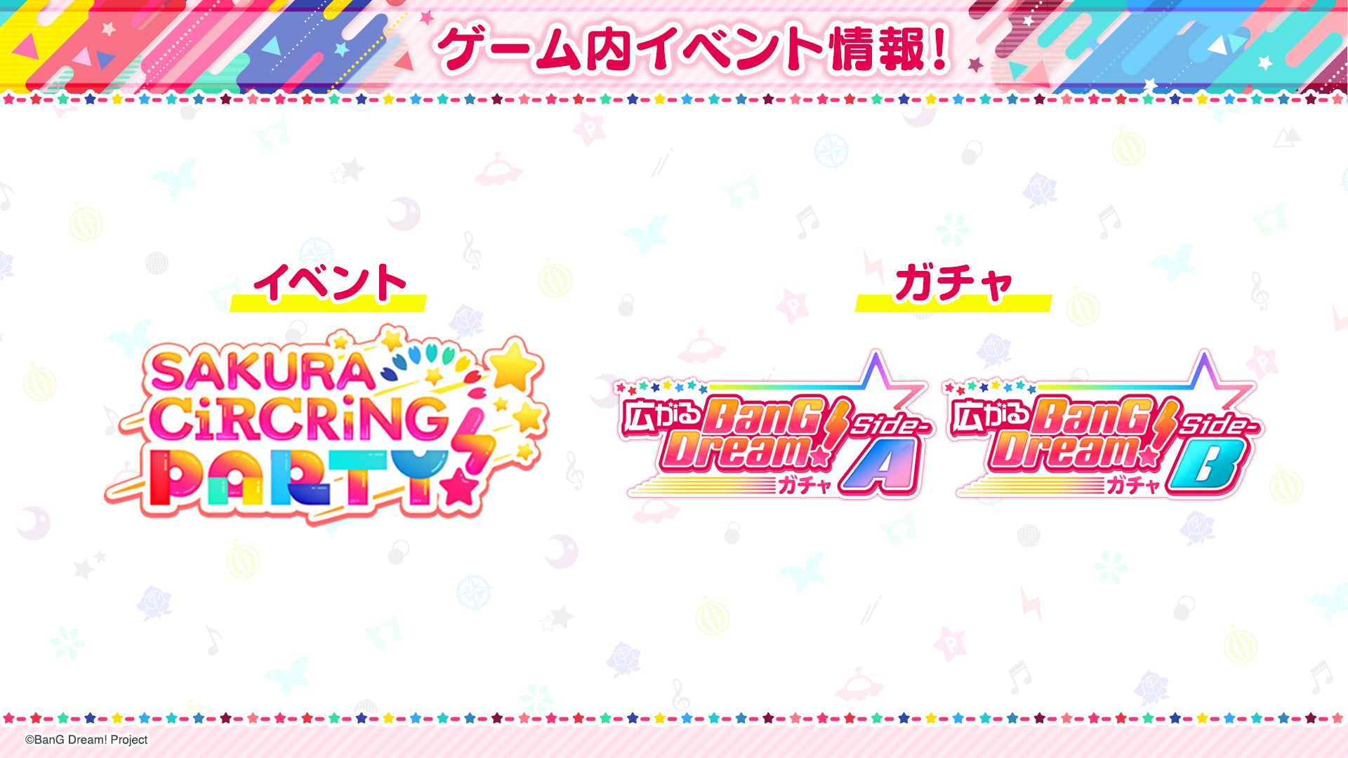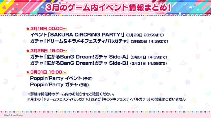 さらに、3月25日(月)からは「広がるBanG Dream!ガチャ Side-A/Side-B」が開催され、3月31日(日)からはPoppin’Partyのイベント・ガチャも予定されています。