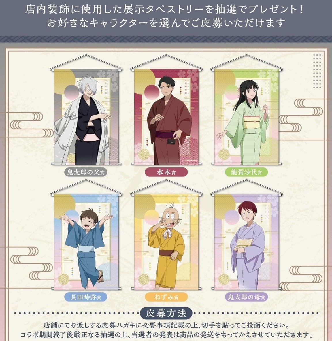 特典として、コースターやポストカードがプレゼントされるほか、抽選で展示タペストリーが当たるキャンペーンも実施されます。