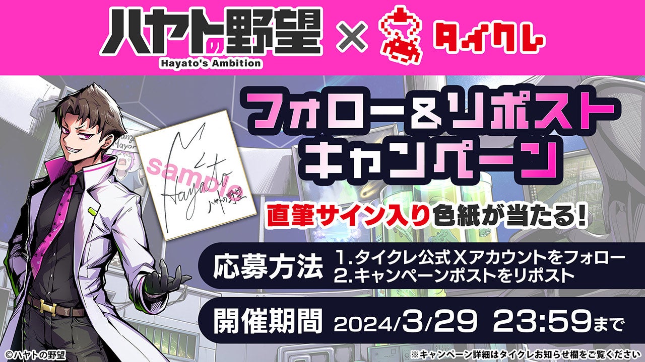 - YouTube登録者120万突破の「ハヤトの野望」がタイクレ限定でスペシャルプライズ発表