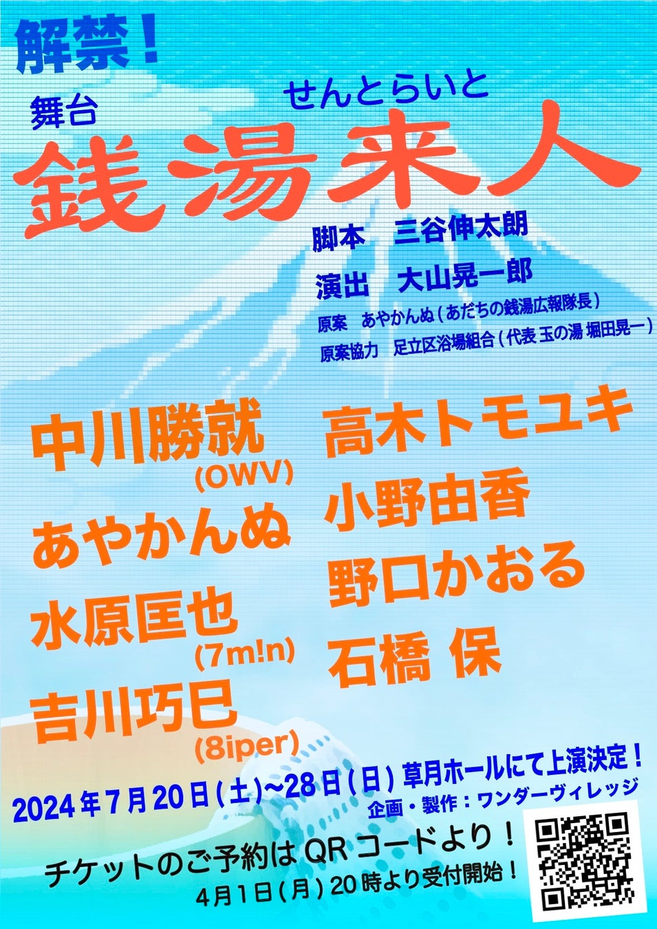 4月1日(月)20:00から舞台「銭湯来⼈」の抽選先行受付が開始されます。