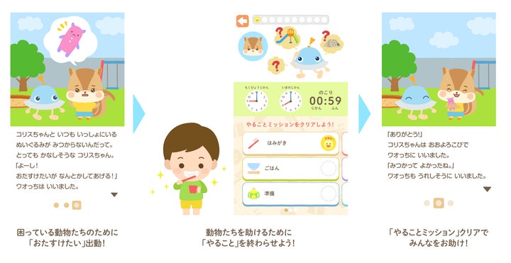 このアプリは、お子さまの生活習慣を楽しくサポートし、保護者が登録したタスクをキャラクターが促してくれます。