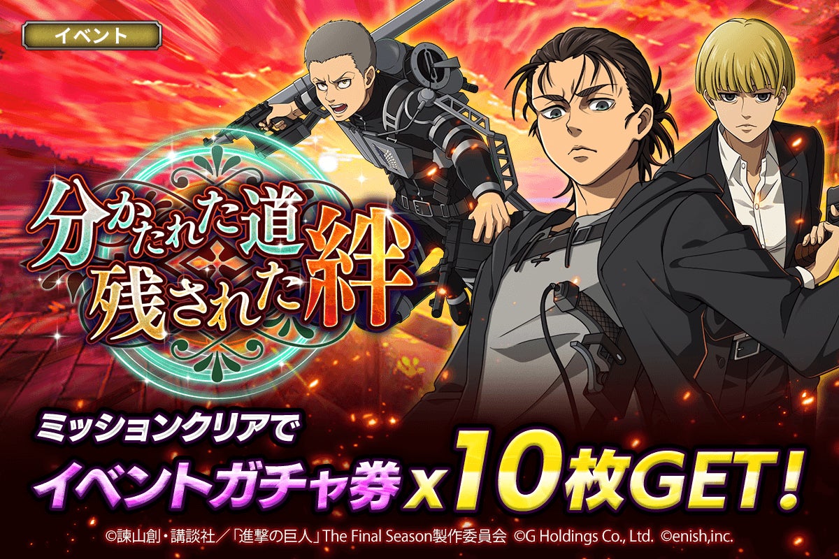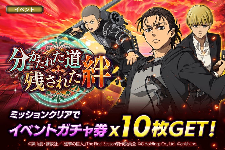 「進撃の巨人Brave Order」公式サイトでは、新ガチャ「分かたれた道、残された絆」が開催中です。