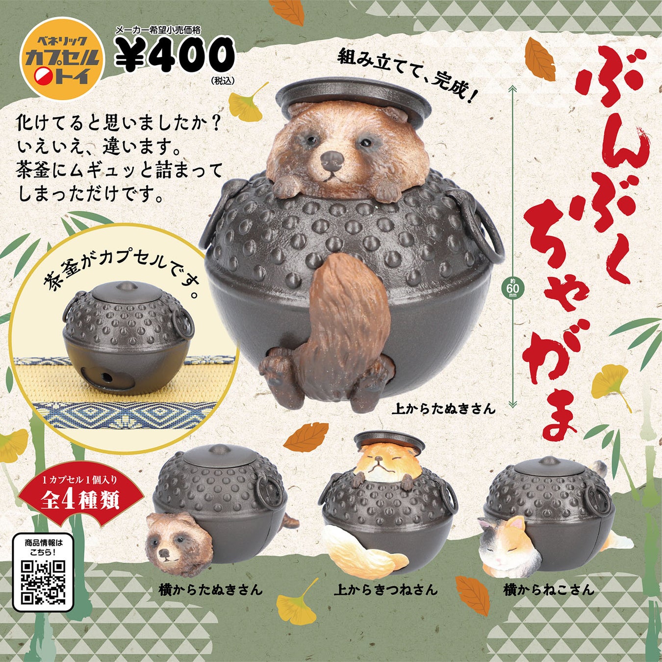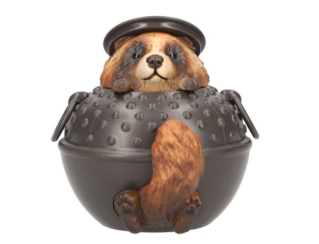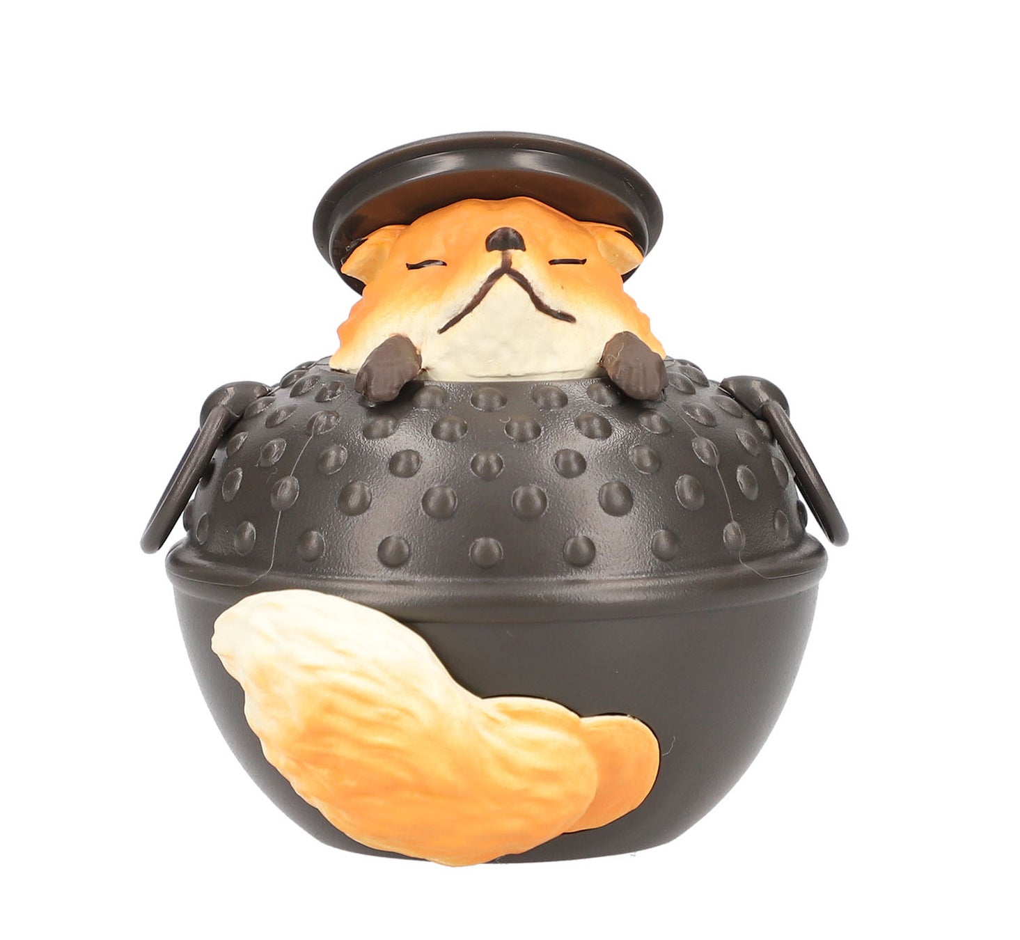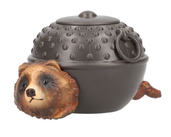 - 「ぶんぶくちゃがま」は、たぬき、きつね、ねこが茶釜に詰まった愛らしいフォルムのアイテム