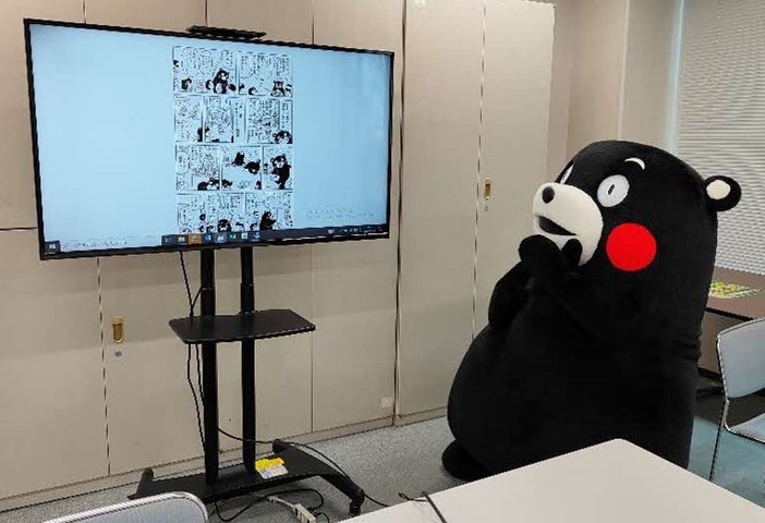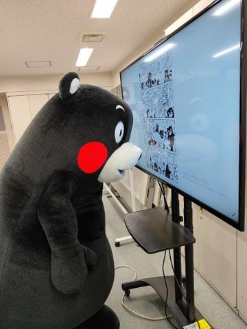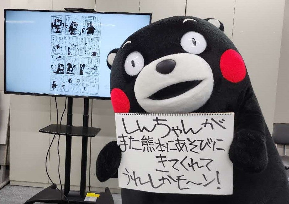 しんちゃんとくまモンの仲良し関係や熊本支援活動が描かれ、くまモン本人も喜んでいる。