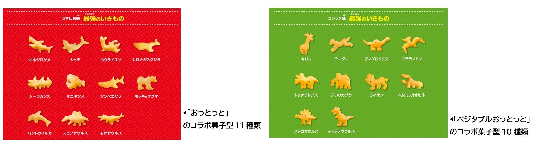 「おっとっと」は、1982年に発売し、ノンフライ製法で仕上げた、中空の軽い食感と繊細な菓子型が特長のスナック菓子です。第5弾となる今回のコラボでは「学研の図鑑LIVE」に合わせたデザインパッケージと全21種類の“最強のいきもの”の菓子型をお楽しみいただけます。(「おっとっと<うすしお味>」では水の最強のいきもの11種類、「ベジタブルおっとっと<コンソメ味>」では陸の最強のいきもの10種類の菓子型。)