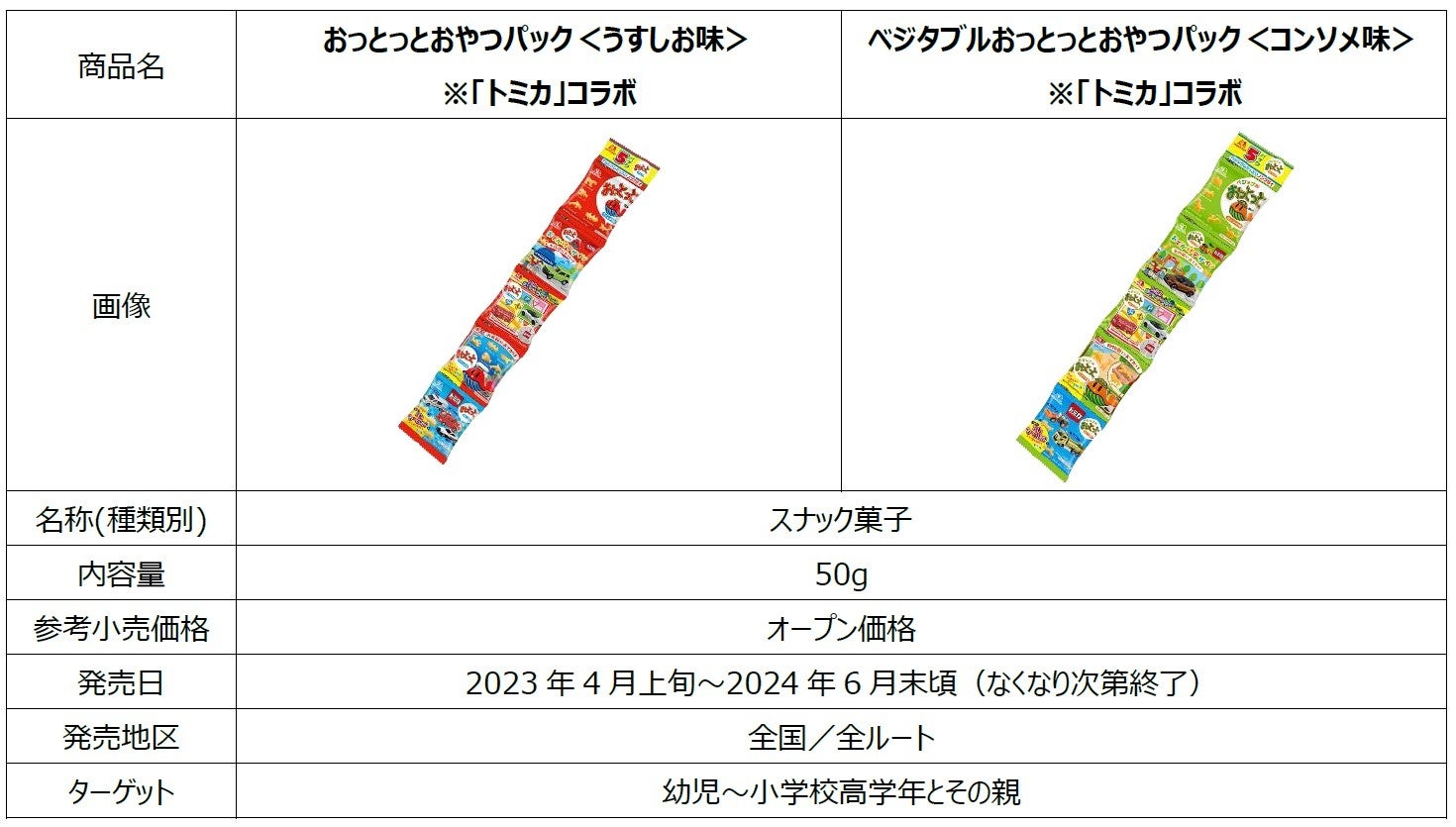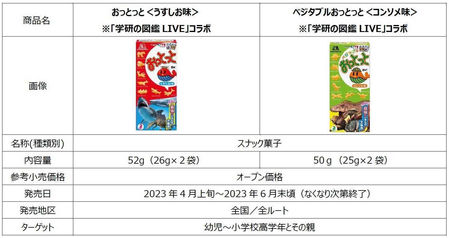 森永製菓株式会社(東京都港区芝 代表取締役社長・太田 栄二郎)は、ノンフライ製法で仕上げた中空の軽い食感が特長のスナック菓子「おっとっと」シリーズにて、「学研の図鑑LIVE」(発行元:株式会社Gakken)とコラボレーションした「おっとっと<うすしお味>」「ベジタブルおっとっと<コンソメ味>」と、「トミカ」(発売元:株式会社タカラトミー)とコラボレーションした「おっとっとおやつパック<うすしお味>」「ベジタブルおっとっとおやつパック<コンソメ味>」を、2023年4月上旬より期間限定で発売いたします。