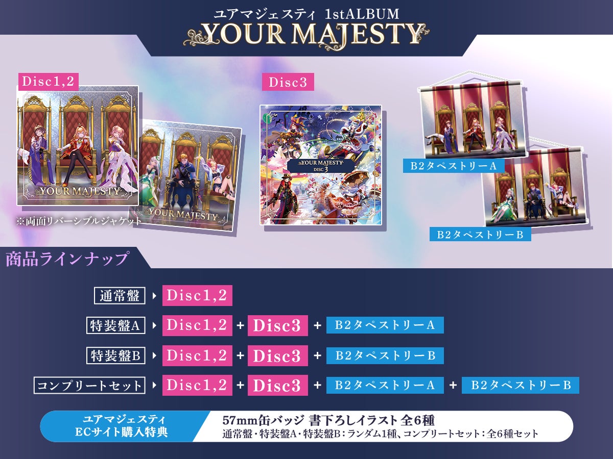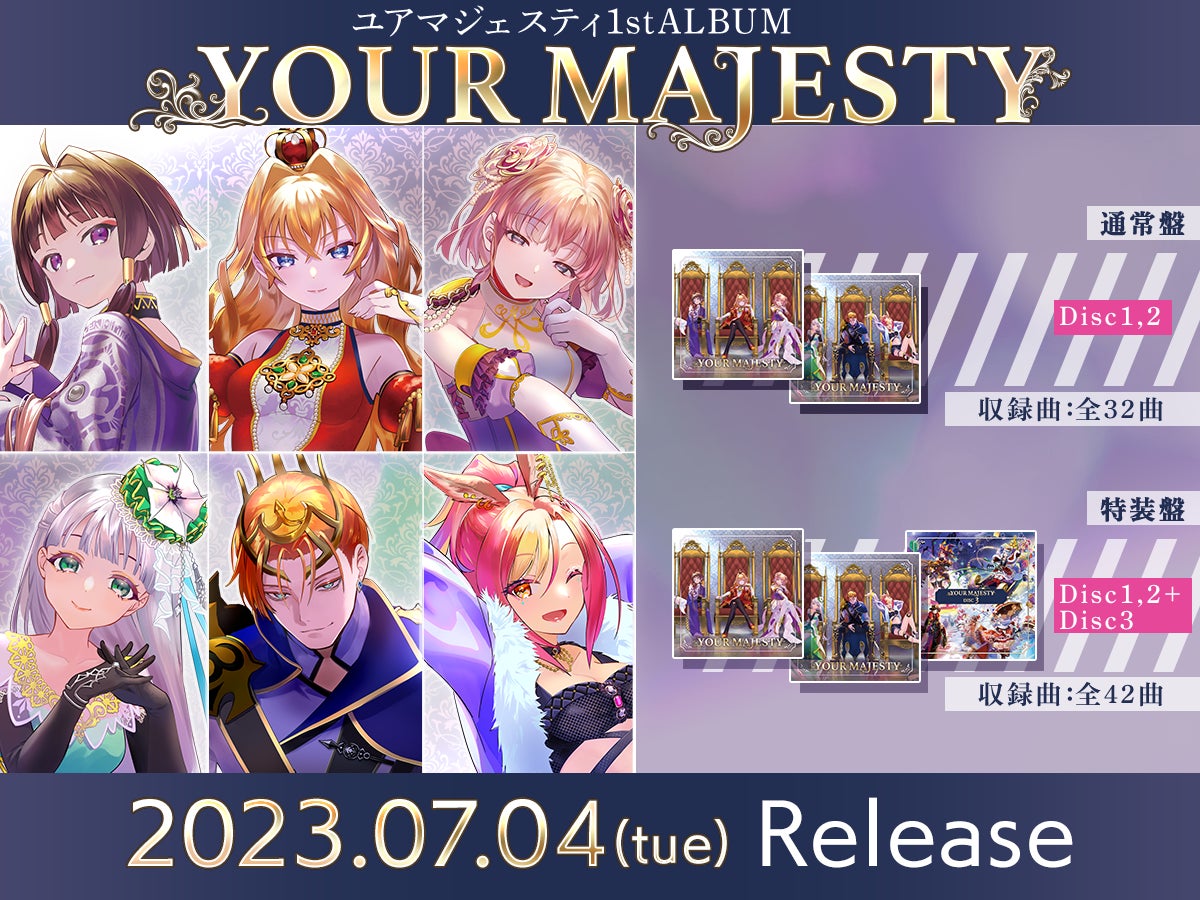 現在、ユアマジェスティオフィシャルストア、アニメイト、タワーレコードにて予約受付中です。収録楽曲や購入特典など詳細は公式サイトにてご確認ください。