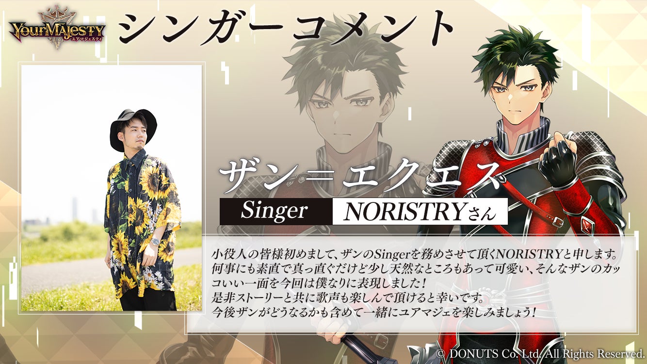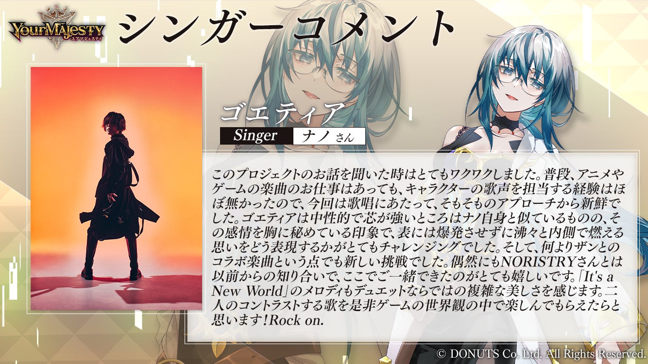 今回新たにシンガーとして起用したのは、“歌ってみた”の動画投稿をきっかけにブレイクした歌い手のNORISTRYと、「王様戦隊キングオージャー」(テレビ朝日)の挿入歌『INFERNO』等で注目を集めるナノの2名です。NORISTRYが【騎士王/蹂躙王 ザン=エクエス】、ナノが【探求王/異形王 ゴエティア】のシンガーとして歌う、『ユアマジェスティ』の新イメージソング『It‘s a New World』はYouTubeにて本日MVを公開いたしました。2人の力強い歌声が生み出す圧巻のハーモニーをお楽しみください。