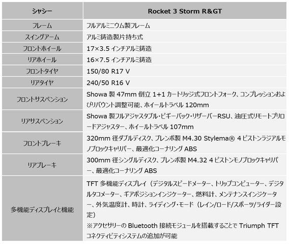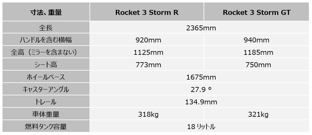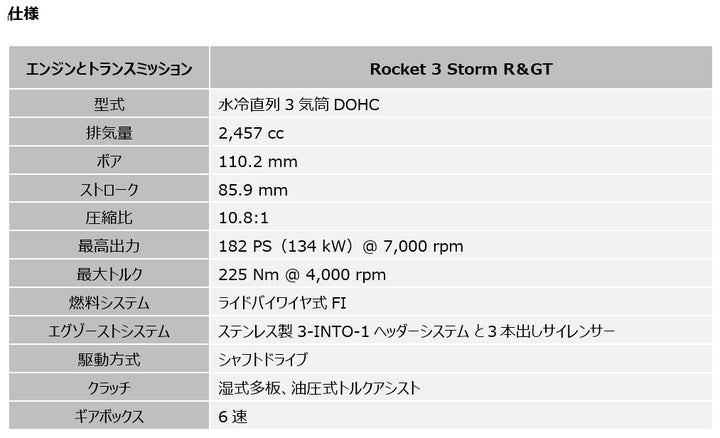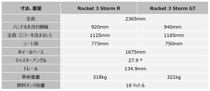 Rocket 3 Stormには、Storm RとStorm GTの2つのモデルがあり、世界最大の2,457ccエンジンを搭載し、182PSのパワーと225Nmのトルクを誇ります。
