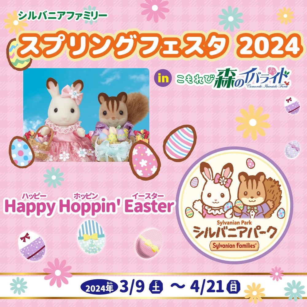 - スペシャルショー、スプリングフェスタ2024 HappyHoppin’ Easter、イースターの装飾、写真撮影、グルメ体験、キャンドルづくり、木のぬりえキーホルダー作り、シルバニアファミリーとのコラボメニュー、シルバニアパーク、こもれび森のイバライド