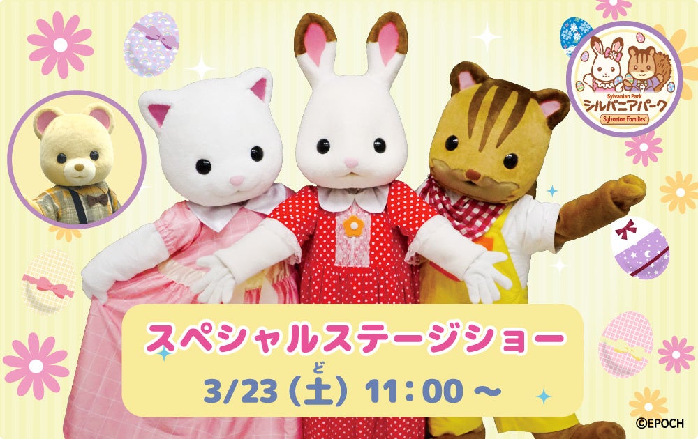 3月23日(土)に開催されるシルバニアファミリーの開村記念スペシャルショーでは、メインキャラクターたちが登場します。